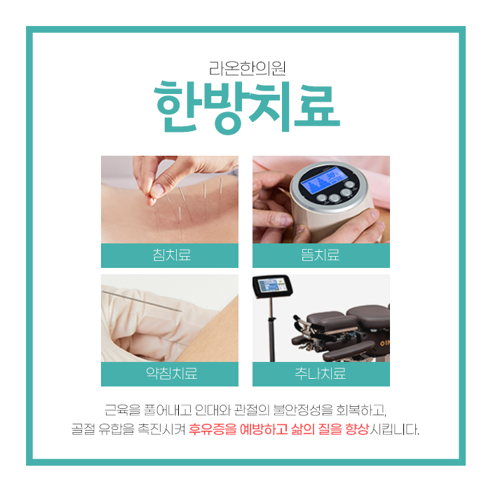 대전입원실한의원은 개인 상태를 파악하고 이를 바탕으로 효과적인 치료 방법을 적용하여 빠른 회복을 도모합니다. 침치료, 약침치료, 추나요법 등 여러 가지 치료를 통해 통증을 완화하고 있습니다. 특히, 추나요법은 비수술적 방법으로 척추와 관절의 정렬을 바로잡아 통증을 줄이는 데 도움을 줍니다.