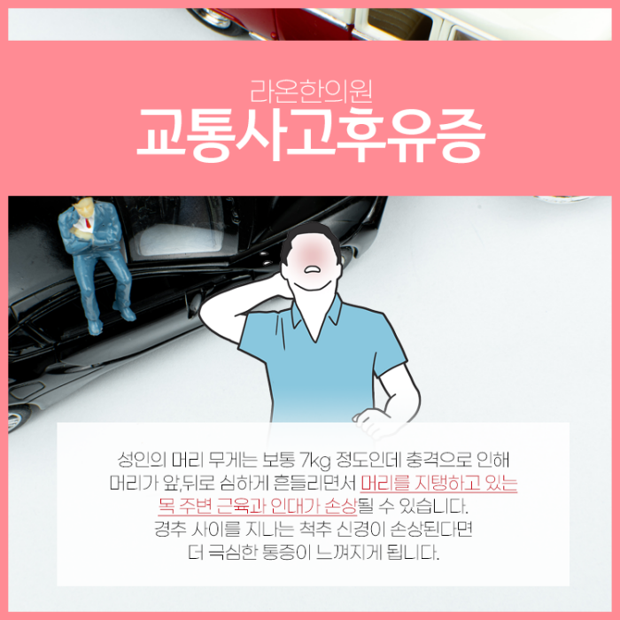 교통사고 후 즉각적으로 대처하지 못해 통증이 악화되었다면 이후 치료가 어려워질 수 있습니다. 통증이 발생했다면 신체 내부를 점검하고 그에 맞는 치료를 받아야 합니다. 목과 머리는 신체의 중심 역할을 하며 사고 시 목은 가동 범위를 넘어 크게 앞뒤로 흔들리게 됩니다.