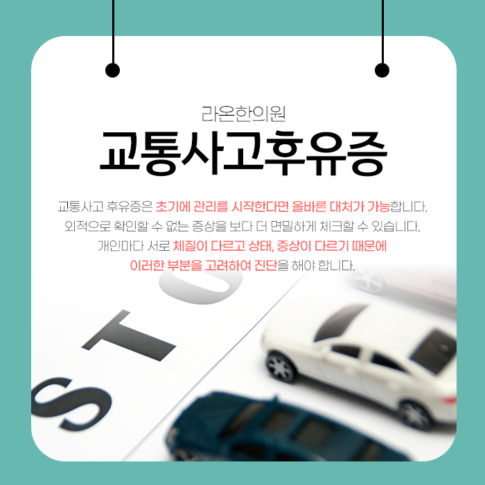 크고 작은 충격이나 사고는 우리 몸에 여러 가지 증상을 유발할 수 있습니다. 증상은 겉으로 보이는 것과는 달리 내부에서 다양한 문제가 발생하고 있다습니다. 사고 후 나타나는 증상은 신체적, 정신적 두 가지 측면에서 다양하게 나타날 수 있습니다. 사고 후 초기 증상이 나타나도 가볍게 여기고 방치하는 경우가 많습니다.
