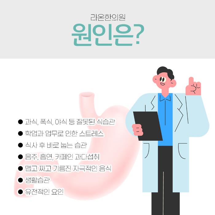 다양한 원인으로 인해 발생하는 질환으로 불규칙한 식습관, 심리적 요인, 선천적인 요인으로 나눌 수 있습니다. 현대 사회에서 많은 사람들이 바쁜 일상으로 인해 불규칙한 식사를 하게 되고 자주 외식하거나 즉석식품을 소비하게 됩니다. 이러한 식습관은 위장에 부담을 주어 담적을 유발할 수 있습니다. 특히 매운 음식이나 짠 음식을 자주 섭취하게 되면 위장 점막이 자극을 받아 소화 기능이 저하되고 담이 쌓이는 원인이 됩니다.