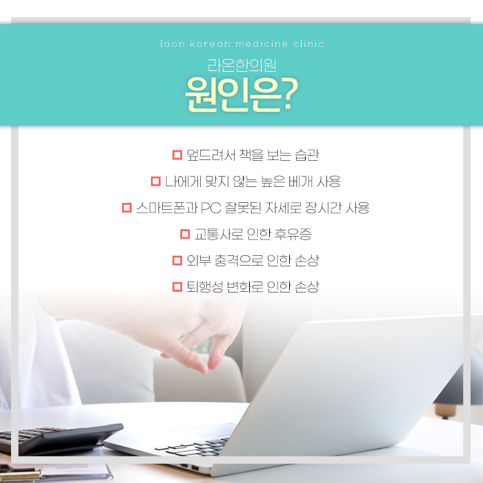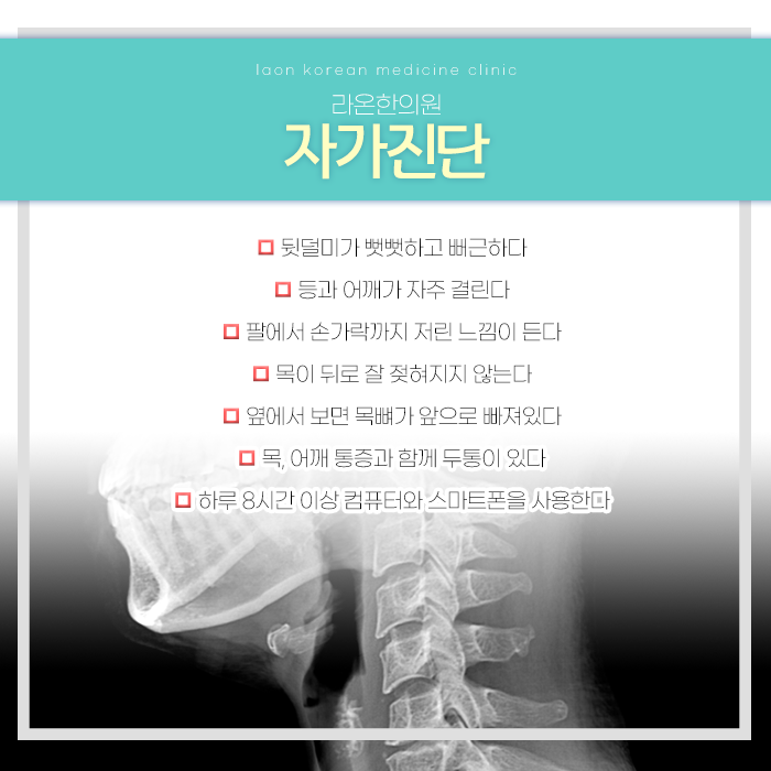 불편한 증세가 계속된다면 근육통이려니 하고 넘기기보다는 경추 디스크 문제일 수 있음을 고려하여 진단을 받아보시는 것이 중요합니다. 경추 배열이 장기간 바르지 못한 상태로 유지되면 목뼈에 가해지는 무게가 정상치의 5배에 달할 정도로 늘어날 수 있습니다.